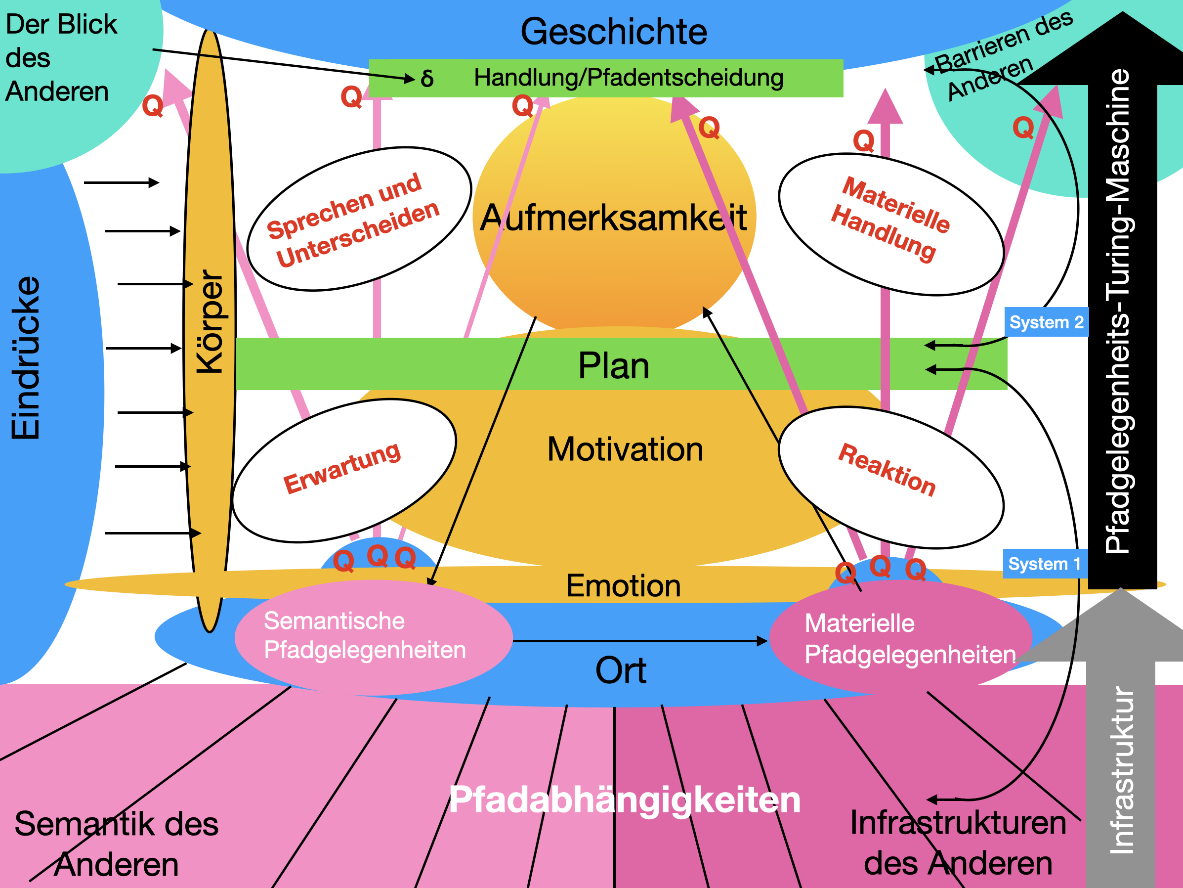 - Erste Pfadabhängigkeit: Erst durch die „projizierten Handlung“ kann es „Handlung“ überhaupt geben. Erst wenn ich einen Pfad projizieren kann, kann ich mich für ihn entscheiden. Alles andere ist nur „Reaktion“.