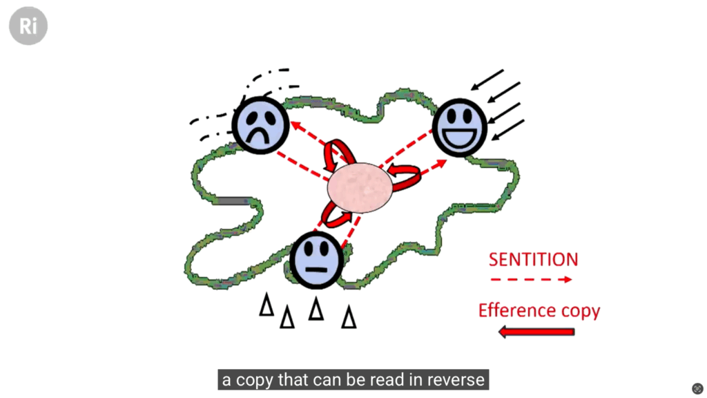 - Dann die entscheidende Phase: Von den Reaktionensmustern werden „Kopien“ angelegt und im Zentrum abgelegt und nervlich adressierbar gemacht. Humphrey meint, dass „Planung“ und komplexeres verhalten damit möglich wird.