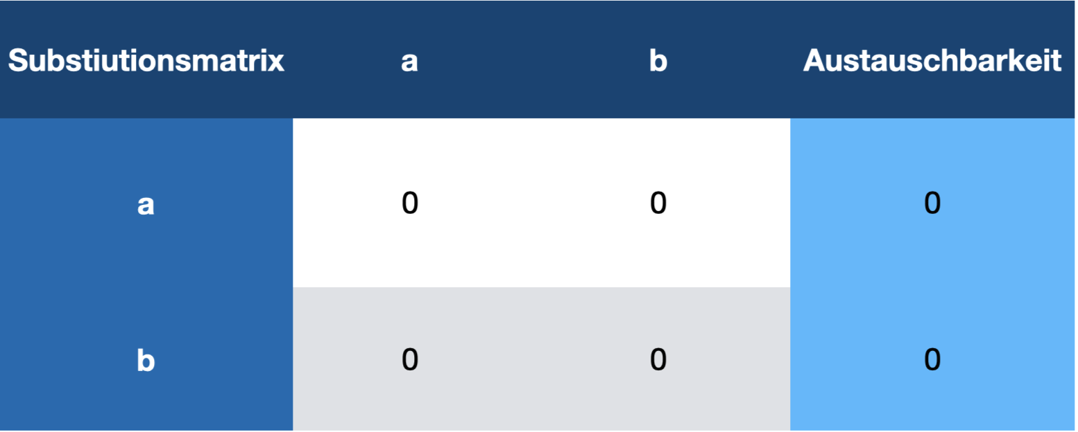 Hier kommt die Substitutionsmatrix rein. Mit der Substitutionsmatrix können wir Austauschbarkeit berechnen, also die Pfadalternativen zum jeweiligen γ.